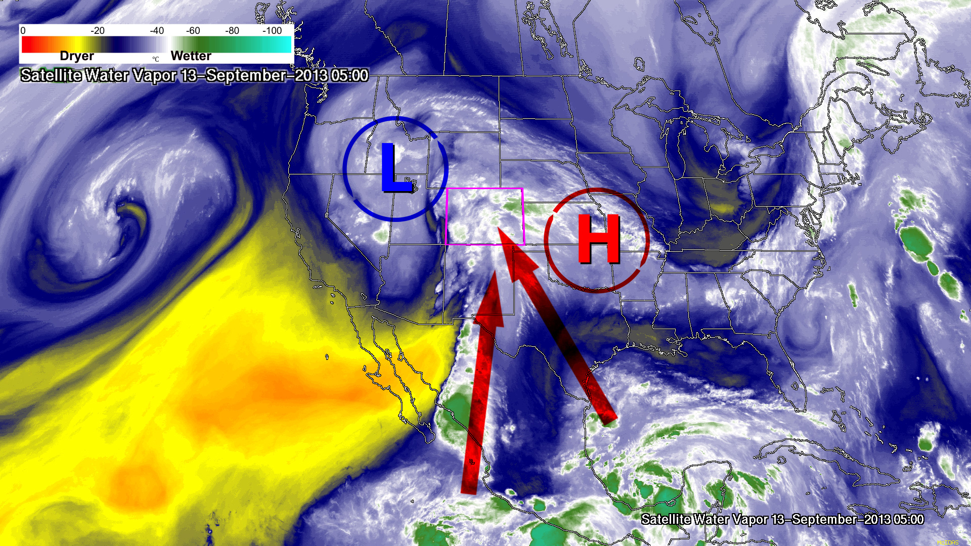 The rains that occurred during the week of September 9th through the 16th, 2013 were different than what we typically see in Colorado. The event was caused by a block in the jet stream that held a low-pressure cell over the Great Basin and a highpressure cell over the Midwest stationary over the course of a week. These stationary circulations drew up moist, tropical air from both the Pacific Ocean and the Gulf of Mexico, dumping rain over New Mexico and Colorado for days. This type of rain event is rare for Colorado, with an estimated 1,000-year recurrence interval measured in the Northern Front Range.
